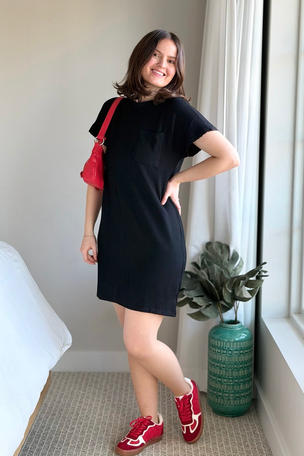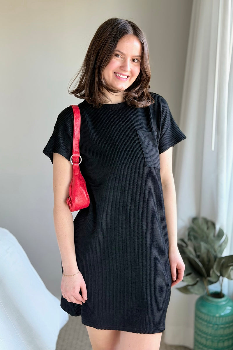Textured Stripe T-Shirt Dress - Black