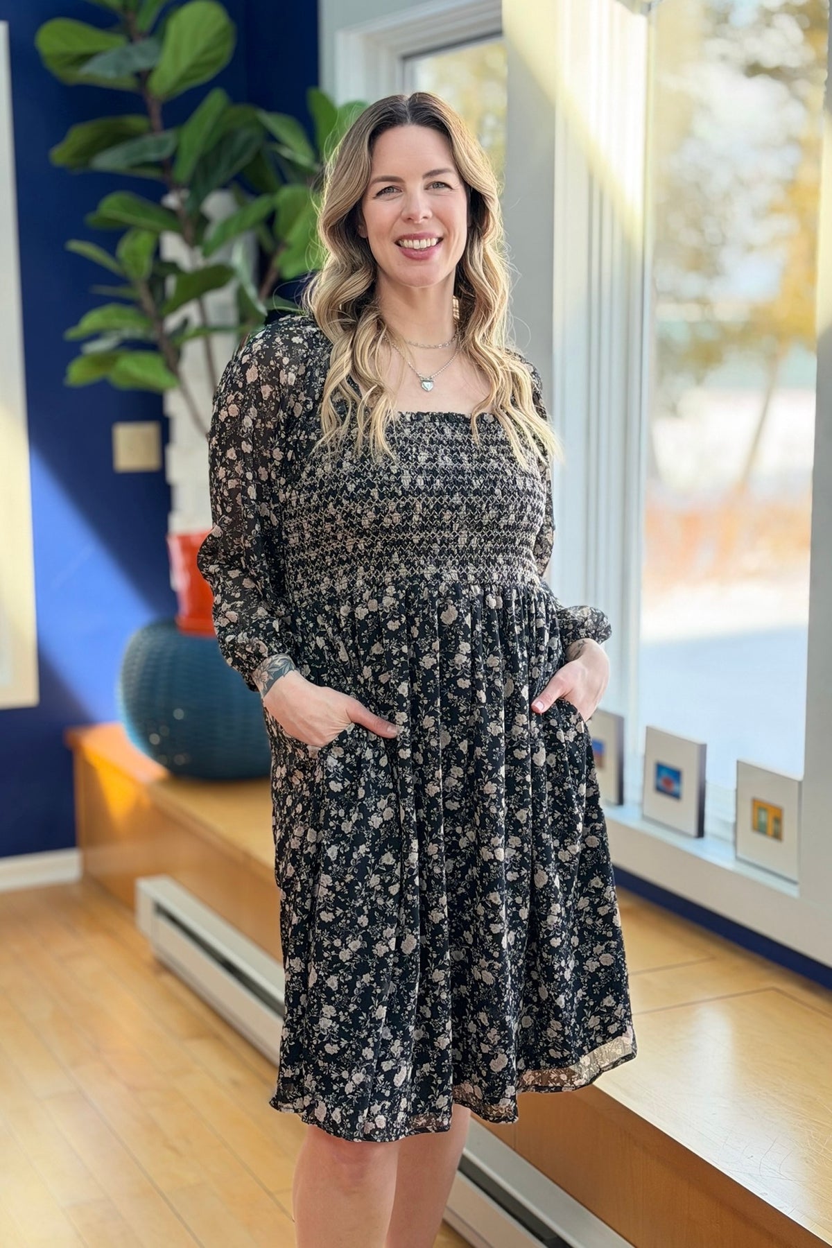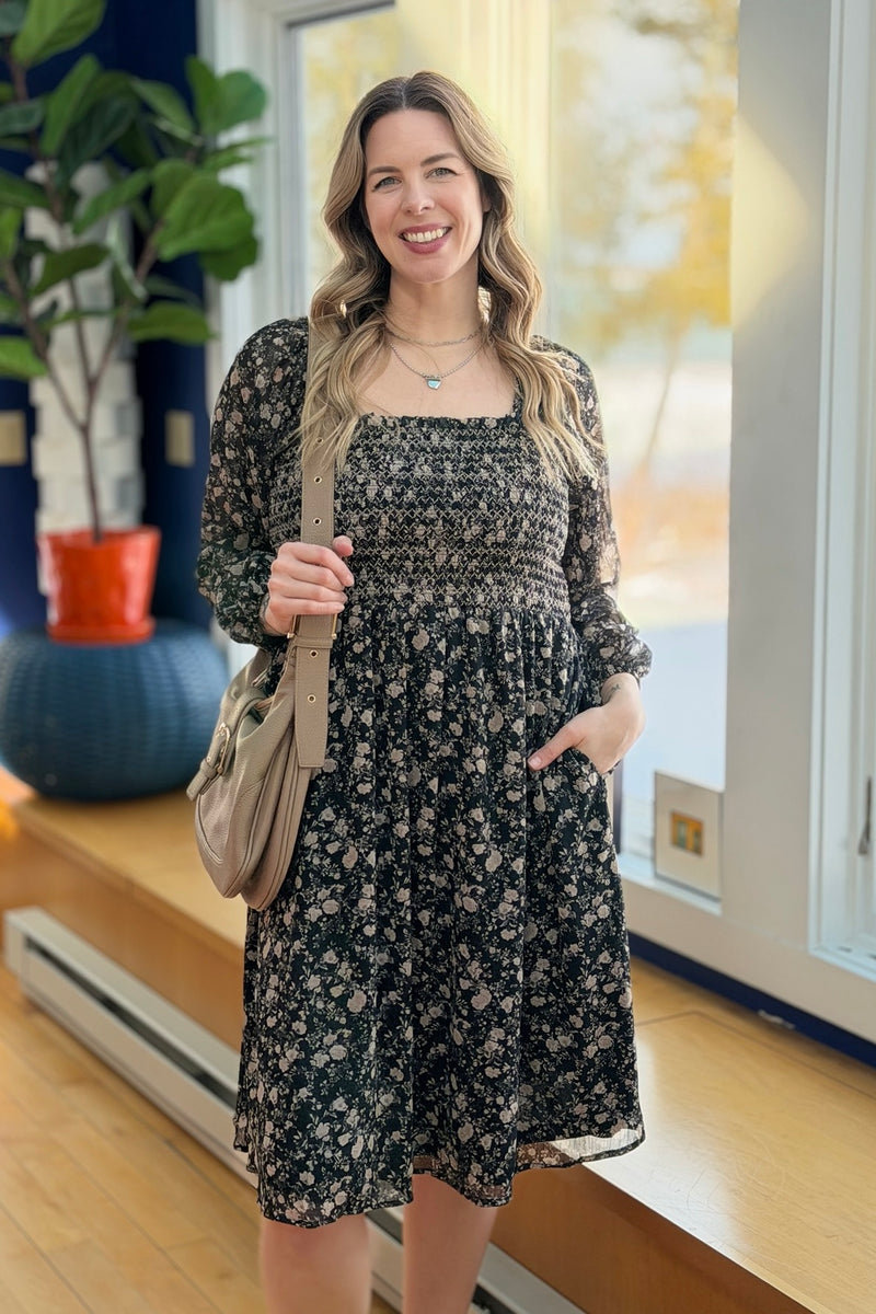 Floral Double Sleeve Mini Dress - Black
