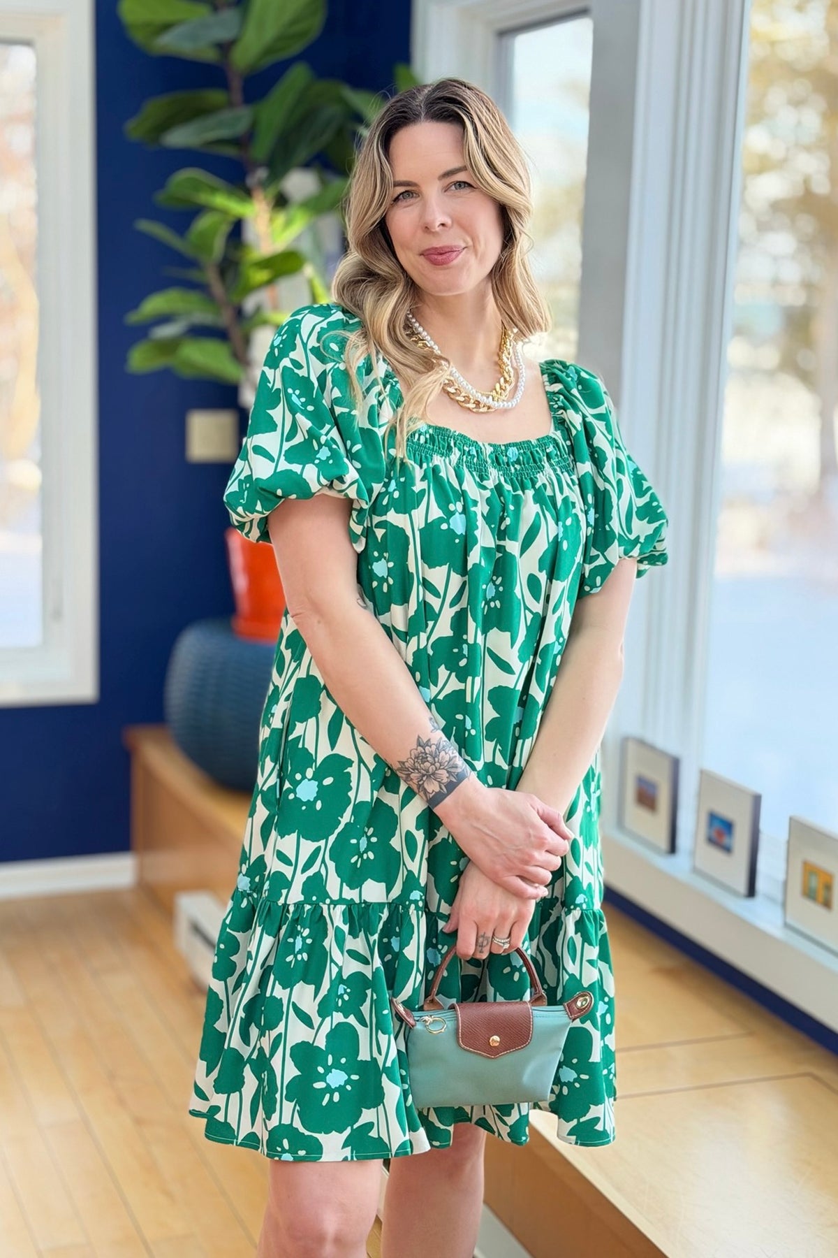 Printed Square Neck Mini Dress - Green
