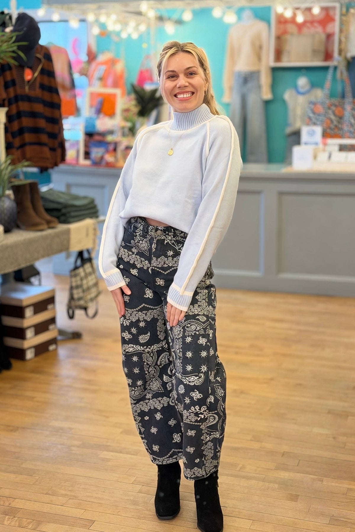 Paisley Printed Denim Pants - Blue