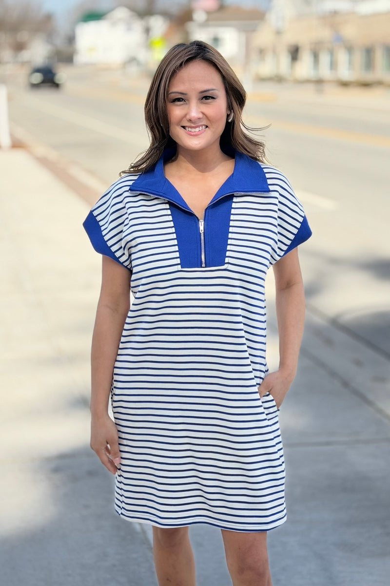 Half Zip Dress With Pockets - Blue