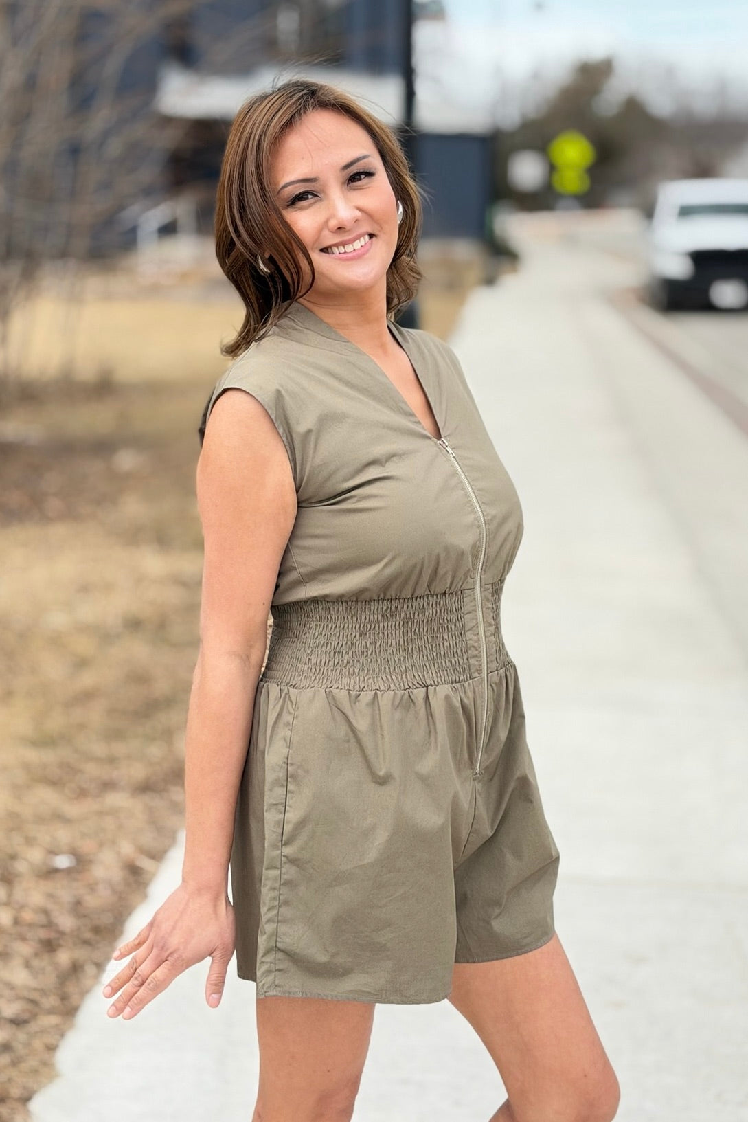 Smocked Waist Zipper Romper - Olive