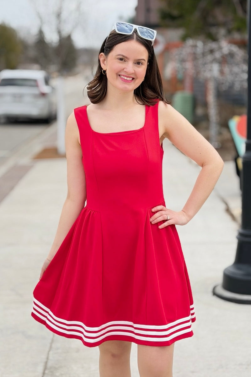 Square Neck Dress With Contrast - Red