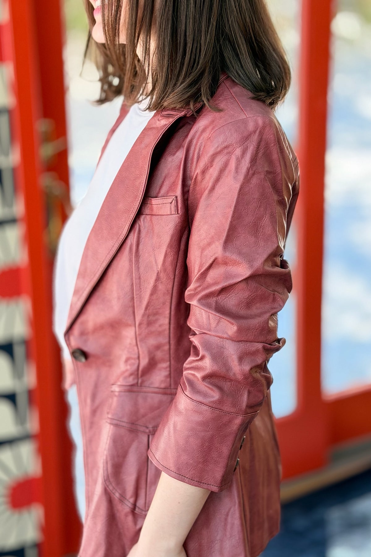 Scrunched Slv Faux Leather Blazer - Maroon