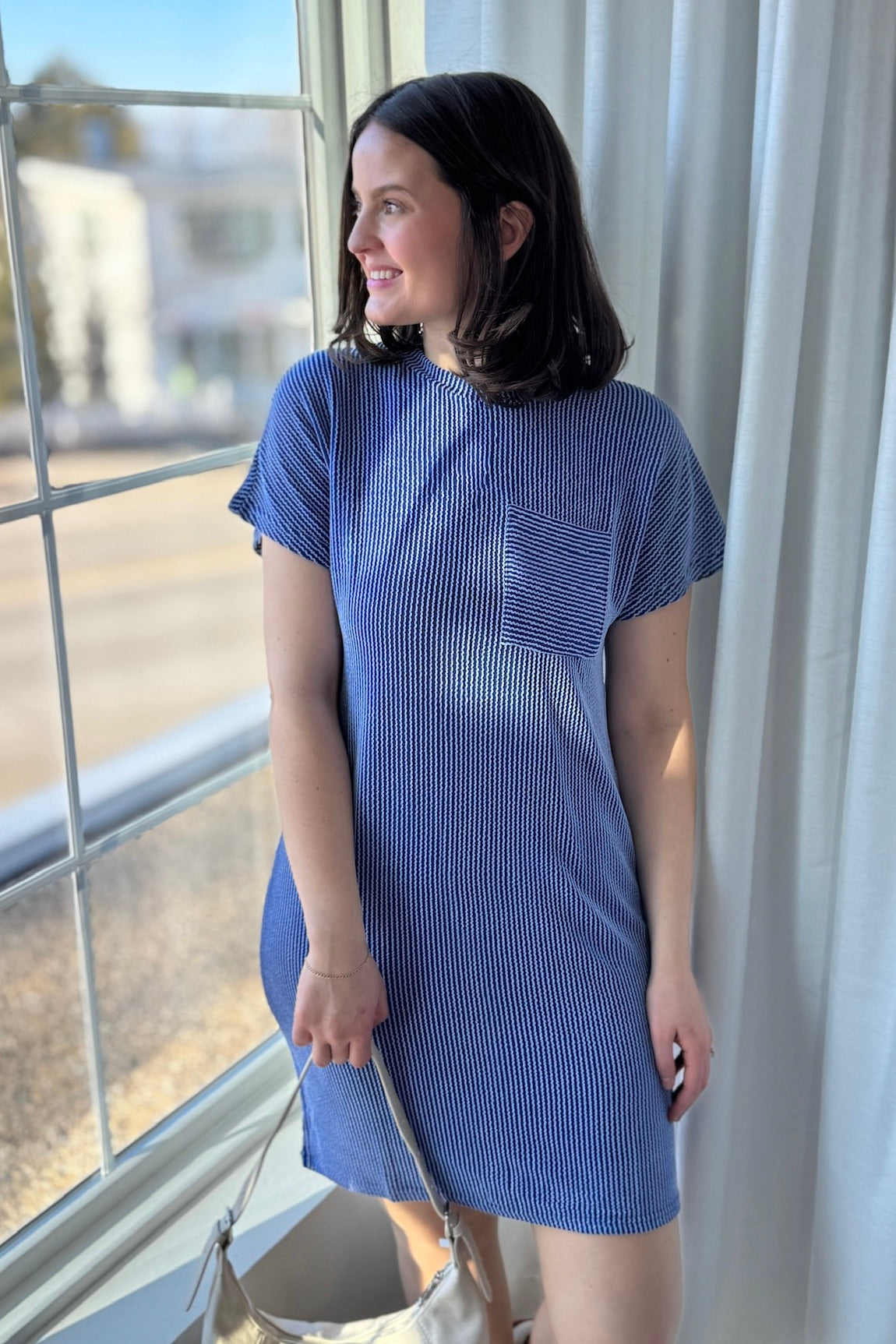 Textured Stripe T-Shirt Dress - Blue