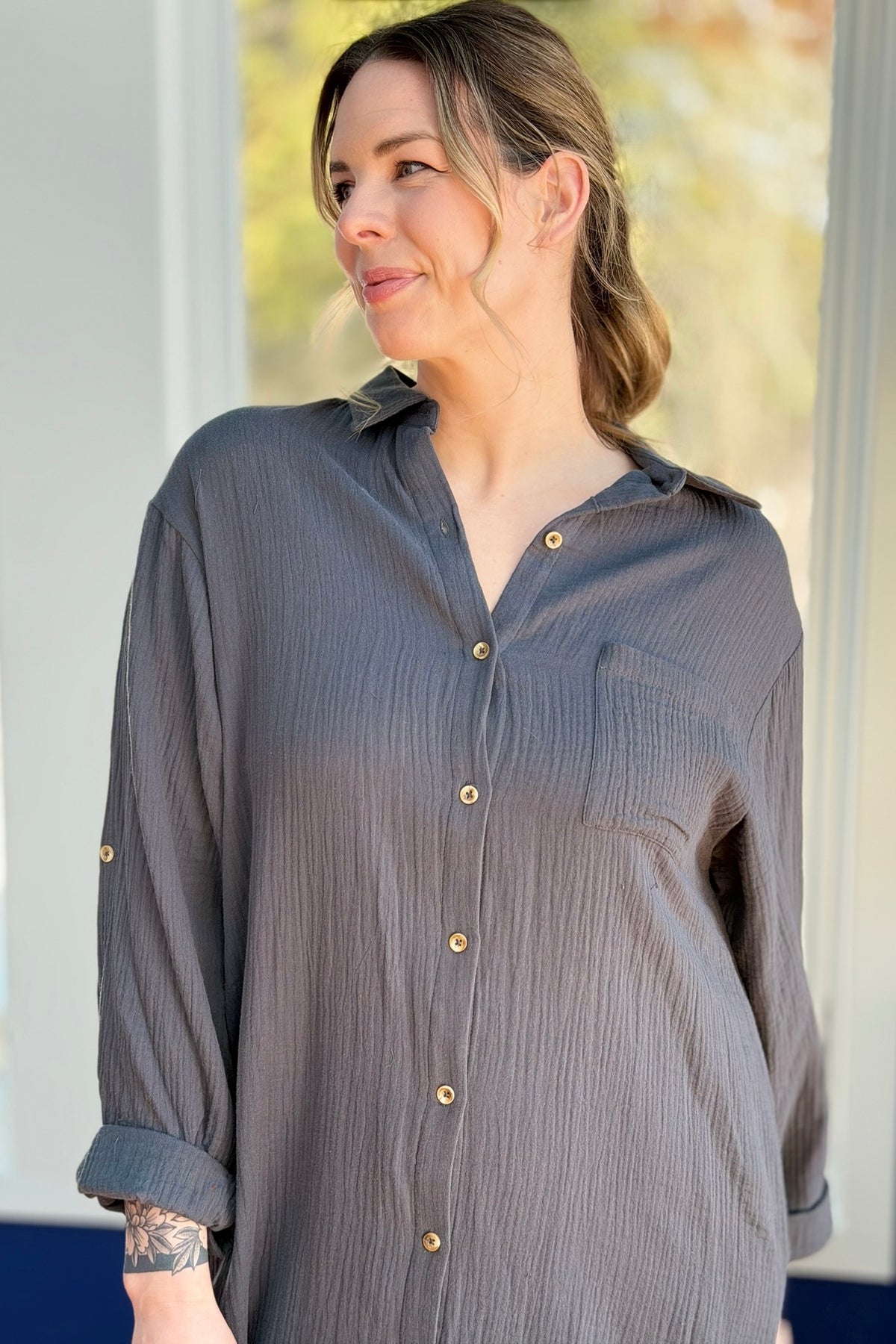 Long Sleeve Button Up Maxi Shirt Dress - Ash