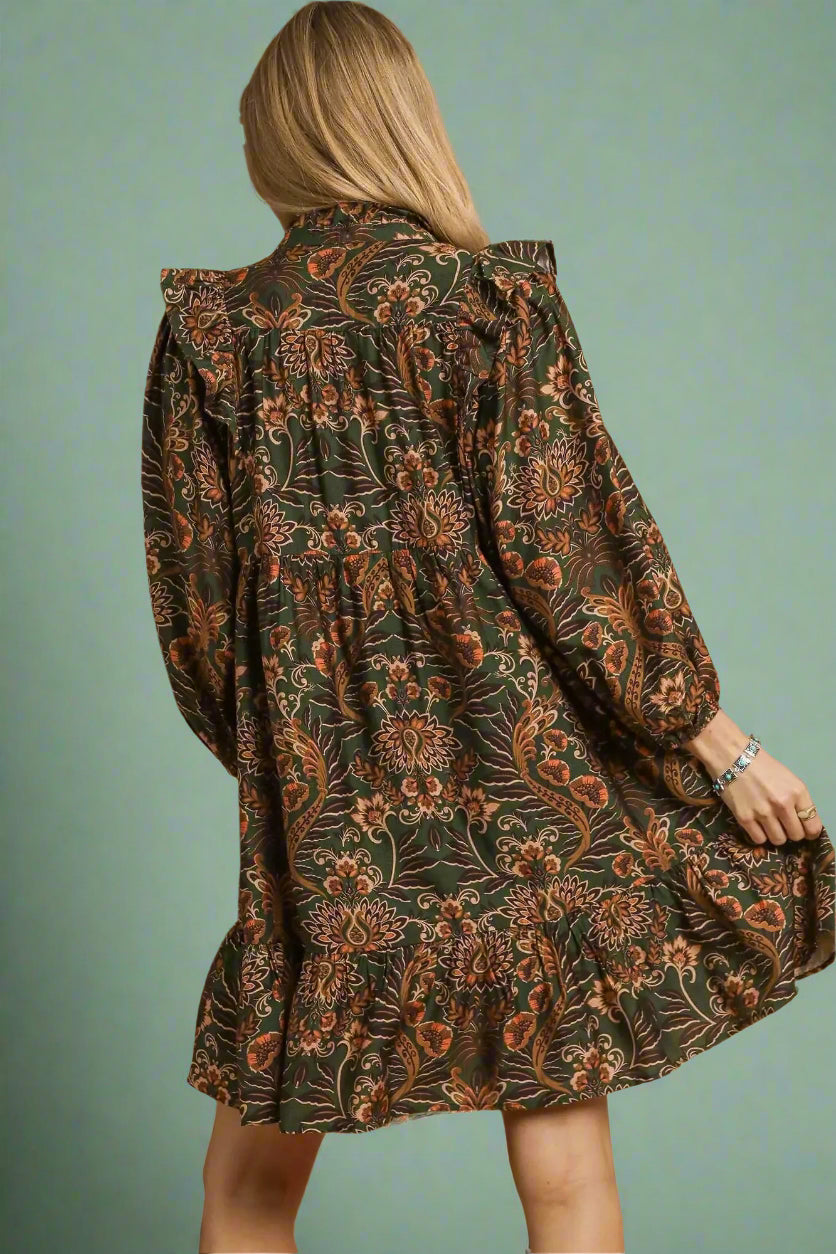 This knee-length dress in olive features playful 3/4 cuffed sleeves with charming ruffle accents and a flattering V-neckline. Its tiered, flowy skirt adds movement and fun to your look, while the fully lined design ensures comfort and coverage. Perfect for twirling through any occasion with ease and style.