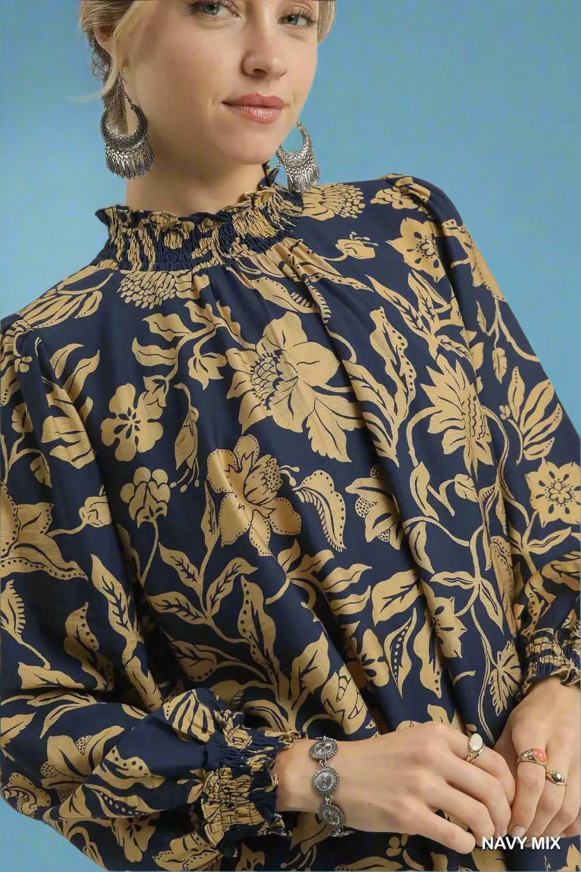 Bring a playful touch to your wardrobe with this navy mini dress featuring an all-over two-tone floral print. The smocked high neckline and cuffed long sleeves add charming details, while the loose, flowy fit ensures comfort and effortless movement. Perfect for days when you want to feel flirty and free.