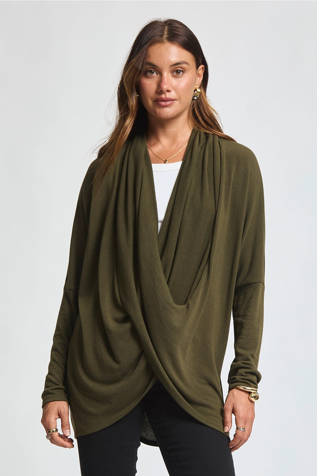 Cozy up in this beautifully draped hacci wrap that’s made for those tricky in-between days. Its stretchy knit fabric hugs you just right, while the playful crossover front and long sleeves add a touch of charm. The longer length keeps you feeling comfy and stylish all day long—perfect for layering or wearing on its own with flair!