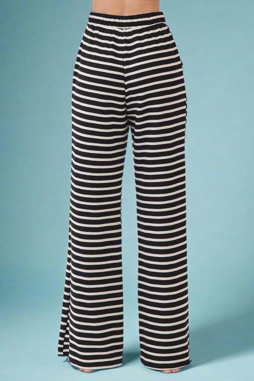 Get ready to lounge or stroll in style with these wide-leg knit pants featuring a playful vertical stripe design. The adjustable drawstring waistband ensures a comfy, high-rise fit, while front pockets add practical flair. Full-length and effortlessly cool, they’re your new go-to for relaxed days with a twist.