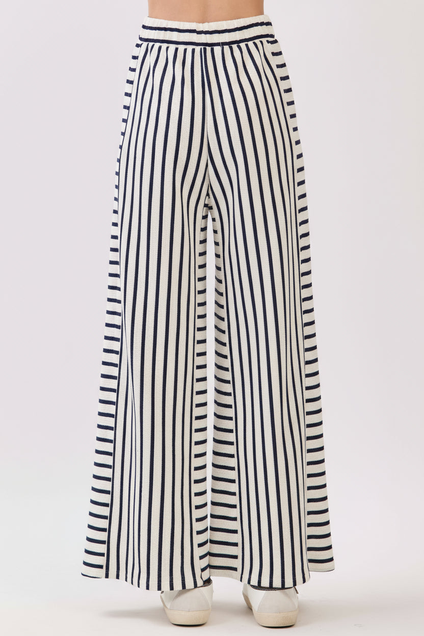 These playful striped wide-leg pants in ivory bring comfort and style together effortlessly. Featuring a flattering vertical stripe pattern and a high-rise, cropped cut, they perfectly balance trendy and cozy. The faux drawstring elastic waistband ensures a snug yet flexible fit, making them your go-to for lounging at home or casual outings. Proudly made in the USA, these knit pants add a fun twist to your everyday wardrobe.