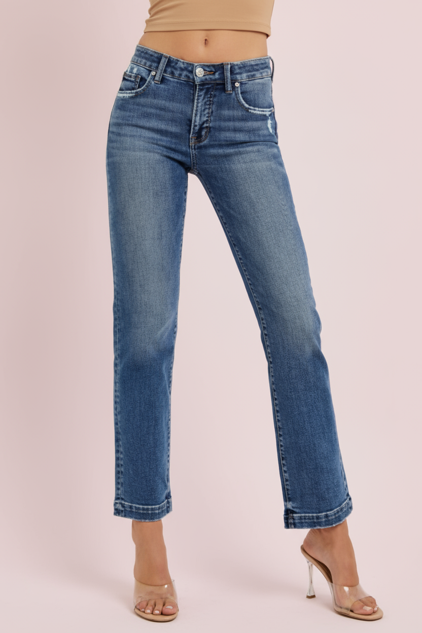 A classic straight fit with the comfort of tummy control and an elastic band. They are mid rise with a dark wash color.