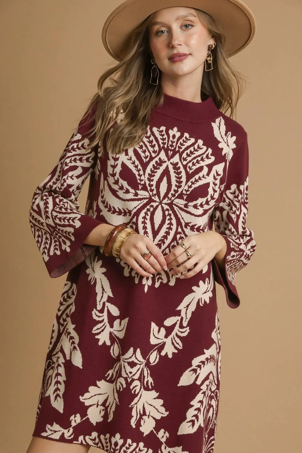 This burgundy knit sweater dress adds a fun and cozy vibe to your look with its soft fabric and playful abstract print. The mini length and A-line silhouette create a flirty shape, while the wide 3/4 sleeves and mock neck bring trendy comfort. Perfect for those days when you want to feel stylish and snug all at once.