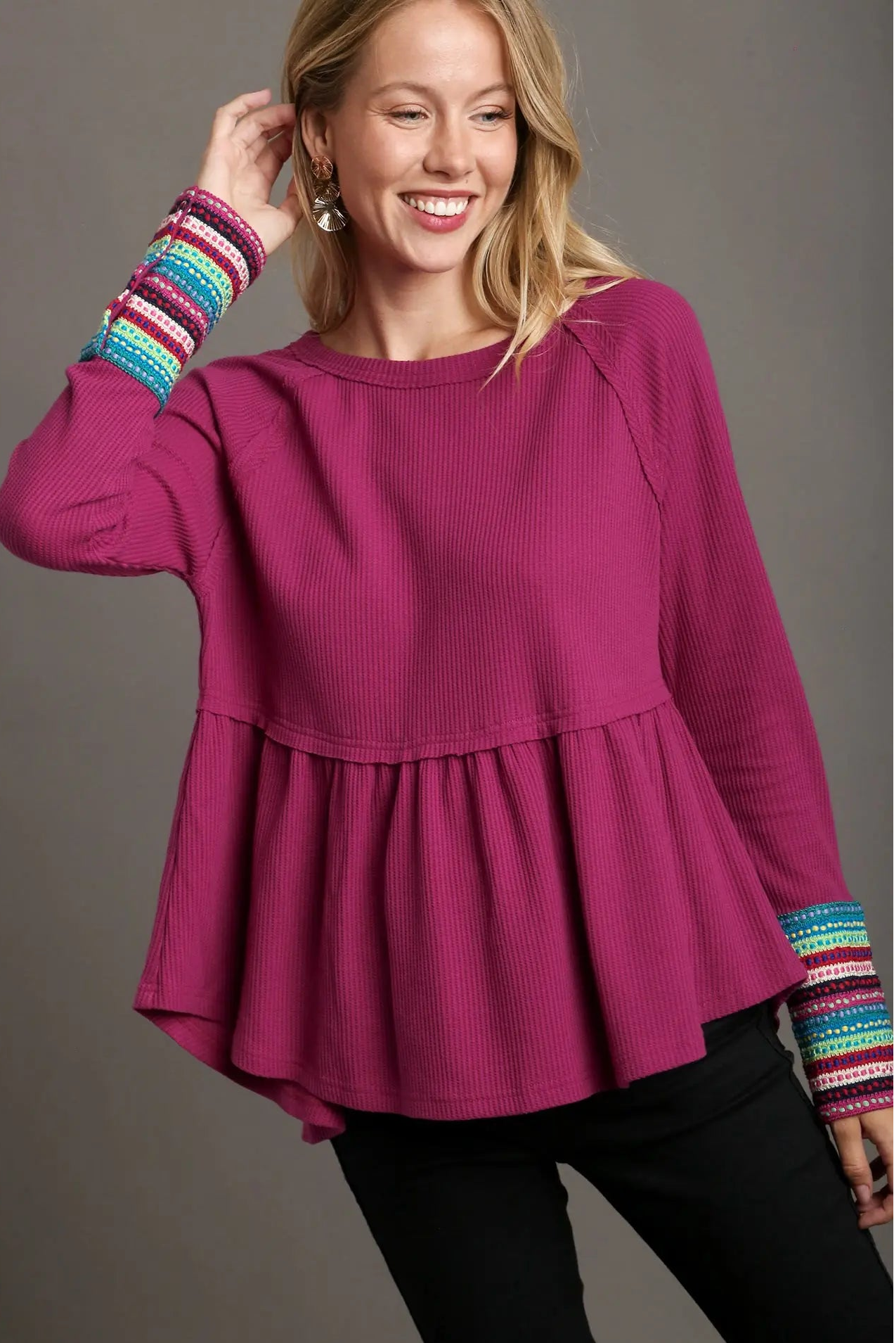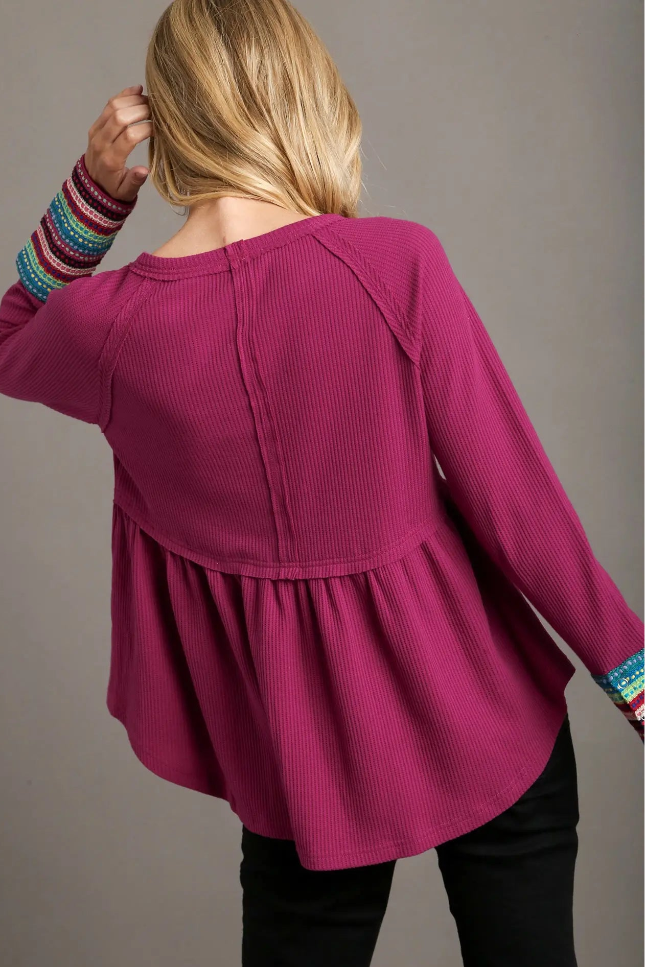Waffle Knit & Multi Color Trim Top - Magenta