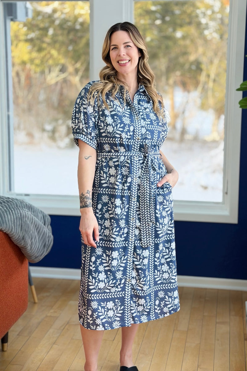 Collared Belted Day Dress - Navy