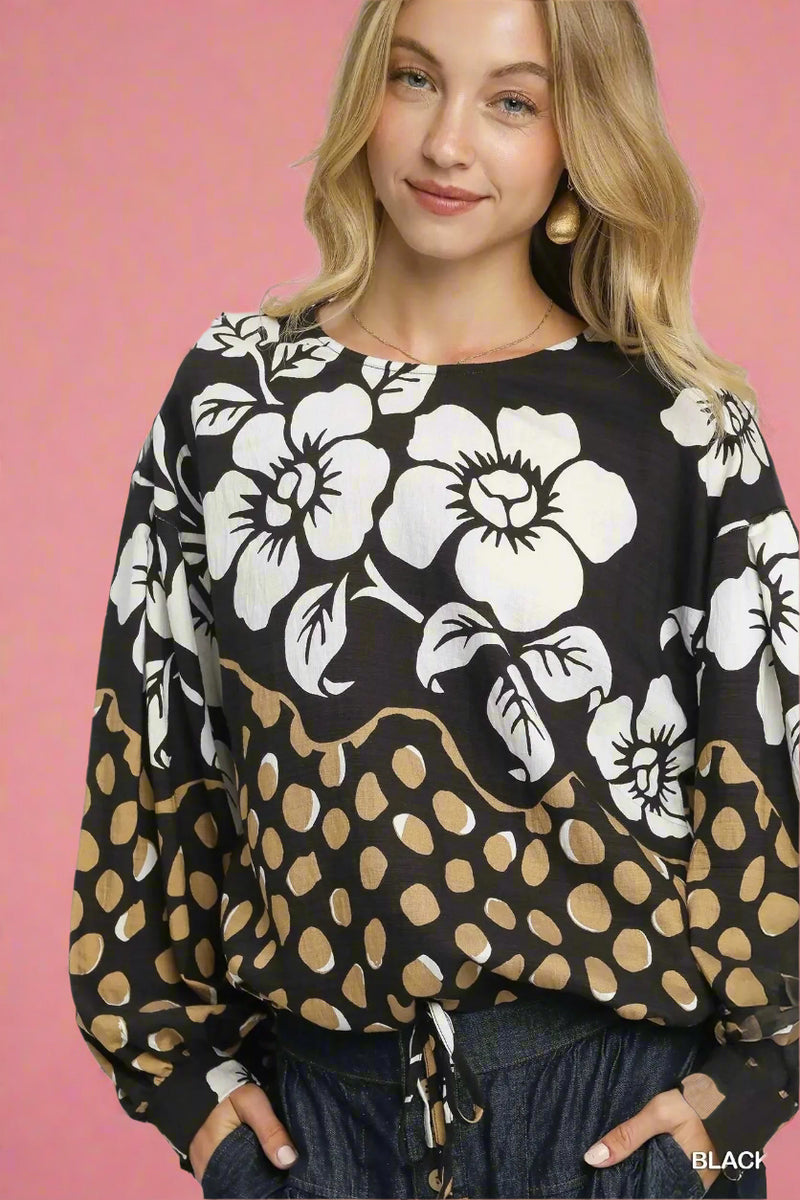Woman wearing a floral blouse with rolled-up sleeves against a plain background
