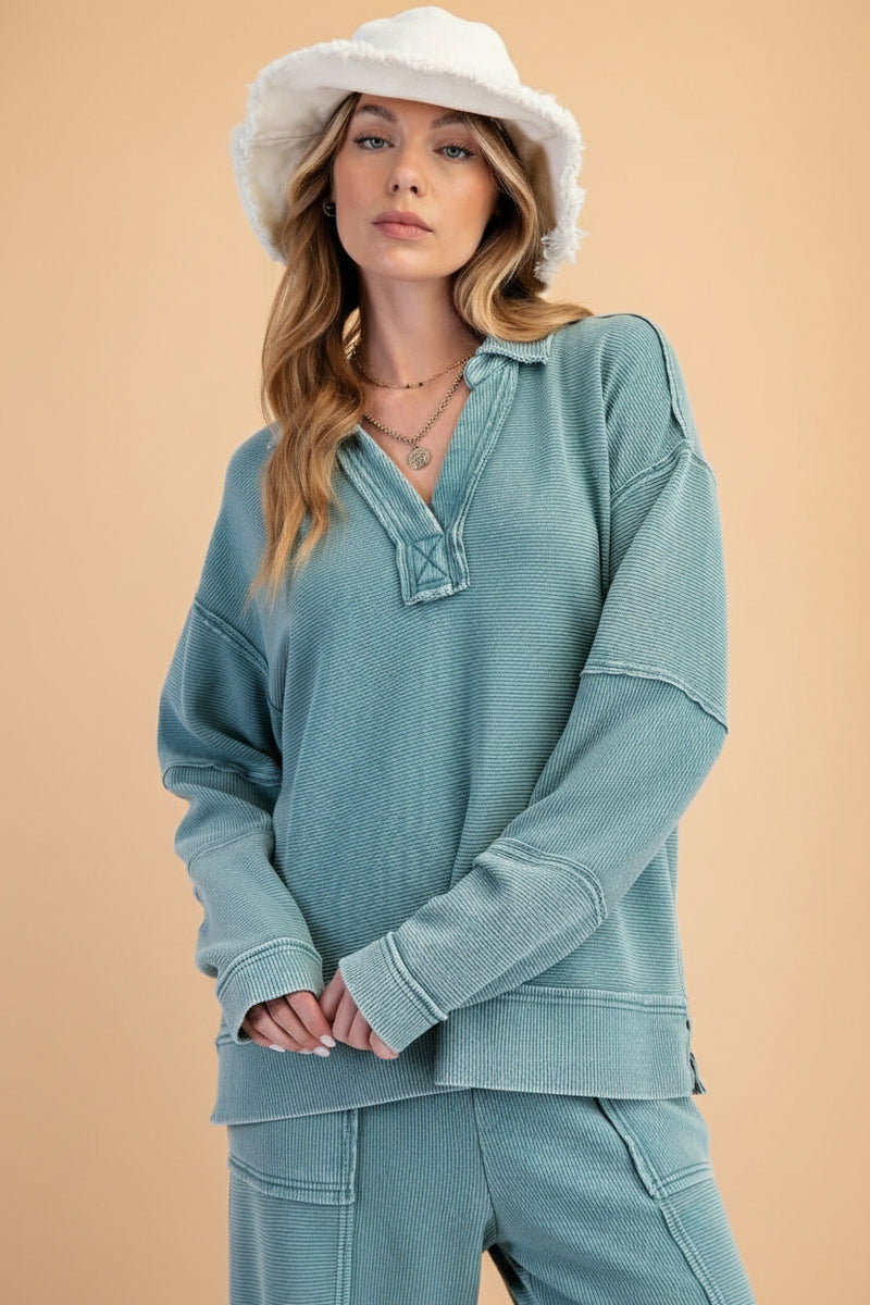 Boat Neck Knit Top Shirring Sleeves - Grey