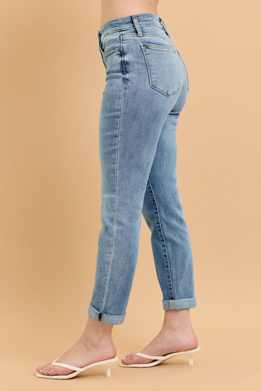 These classic jeans give a "walk on the beach" vibe with the rolled cuff and light-medium watch. They are mid rise and have some stretch. They are a boyfriend fit and bleached look.