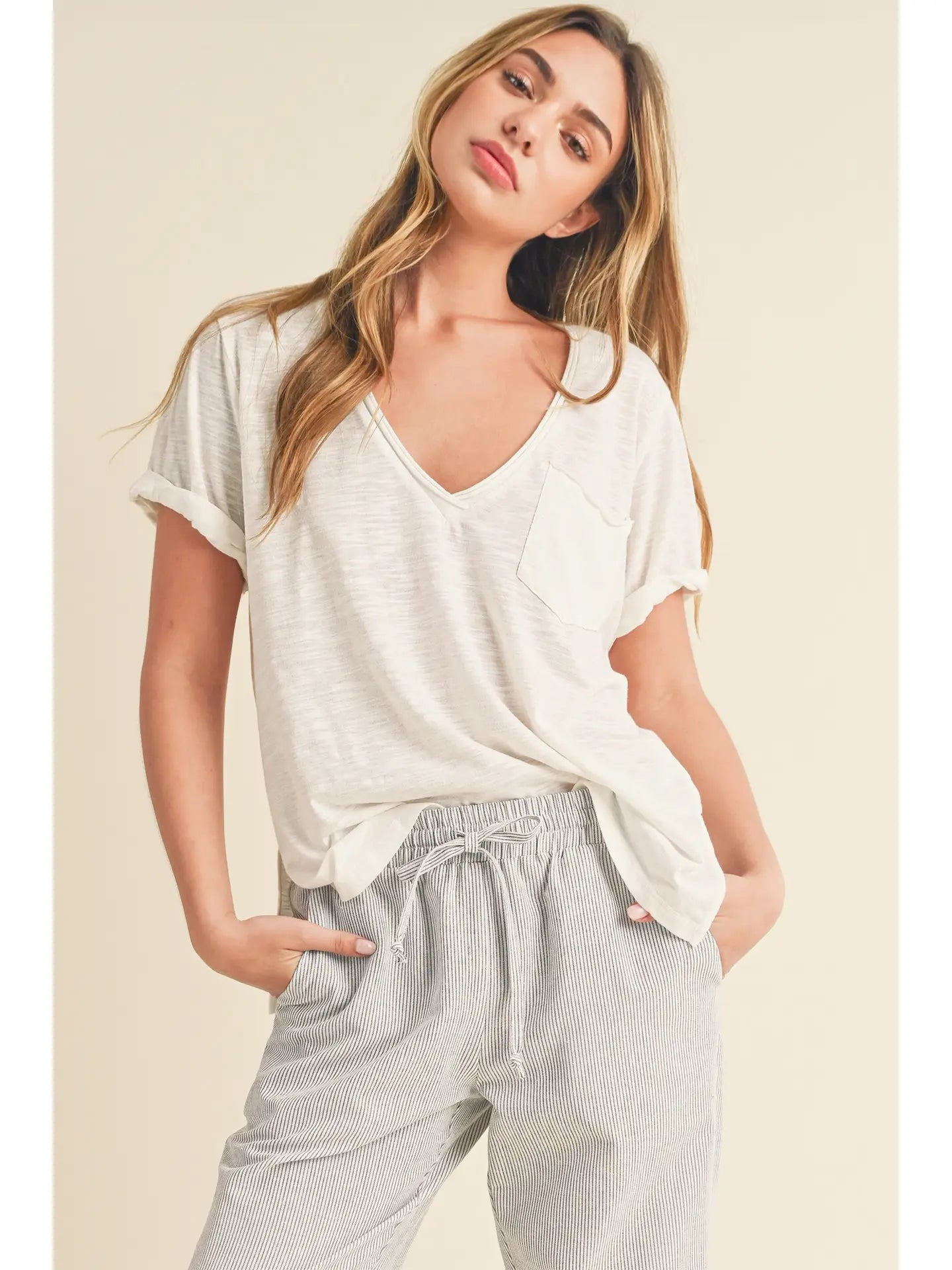 Meet Zoie, the most "raw" and "casual" tee you'll ever need. With a V-neck, pocket, rolled cuffs, and side slits, she's a laid-back beauty with a twist. Plus, her white hue adds a classic touch to any outfit. Get ready to turn heads with Zoie Rolled Sleeve Tee.