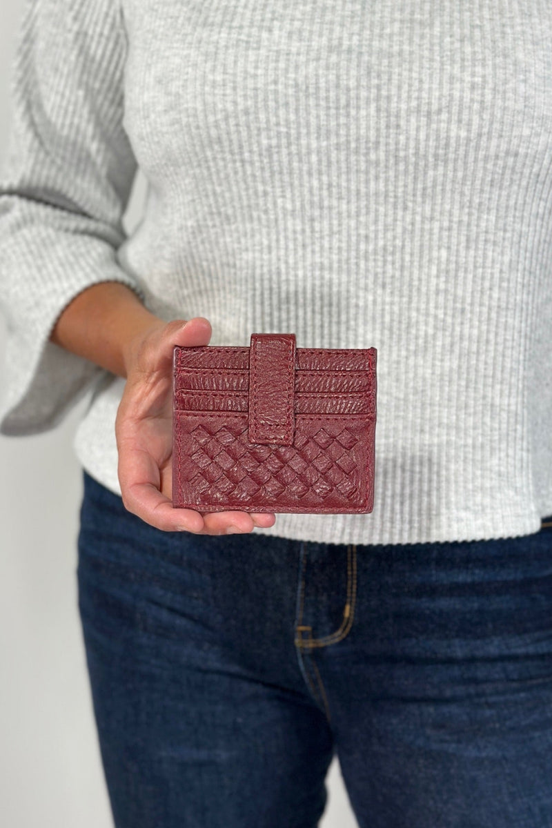 Model is wearing a bright red crossbody bag that features a metallic guitar style strap.