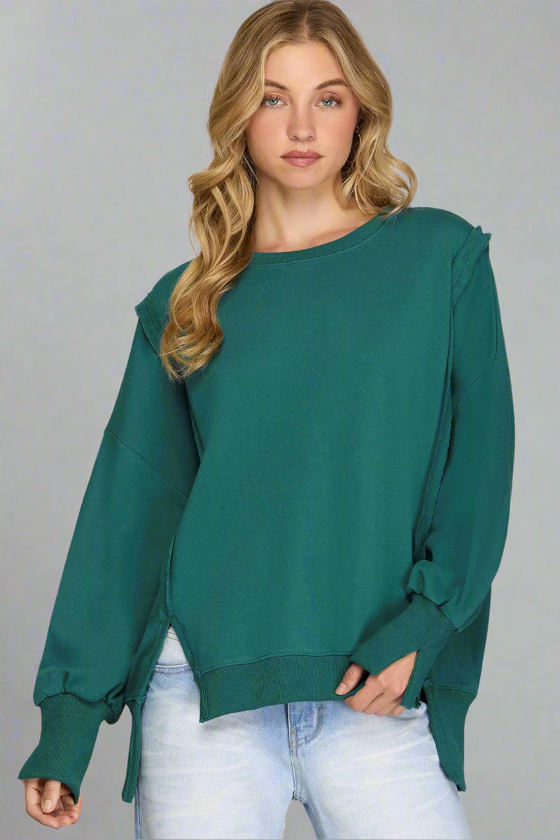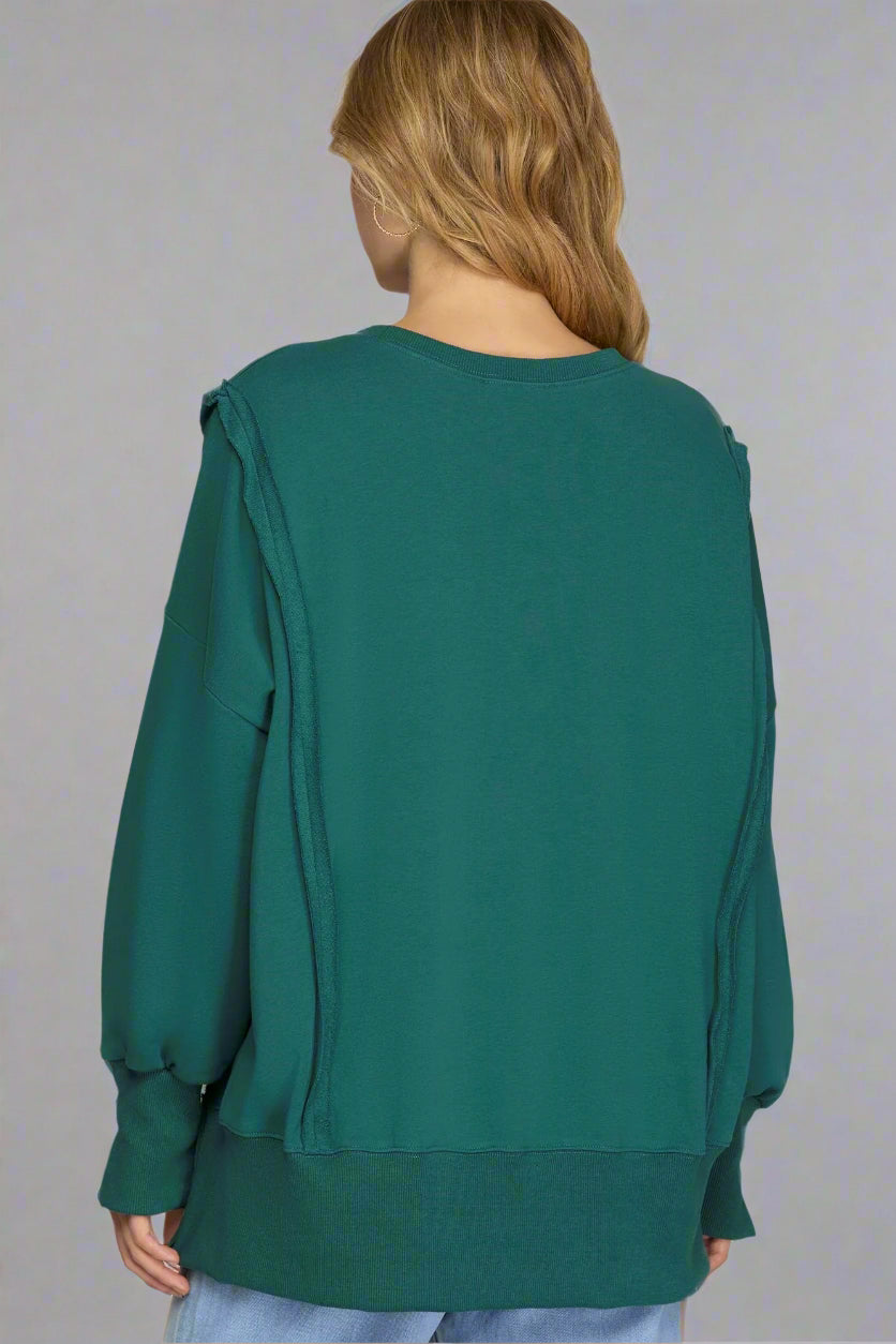 A dolman top in a blue, purple, and grey swirl pattern. It is lightweight and long in length.