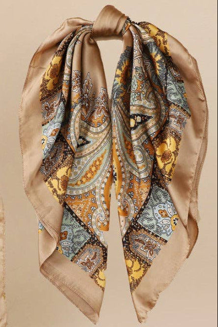 A lightweight summer scarf. It is a palm leaf pattern in shades of blue.