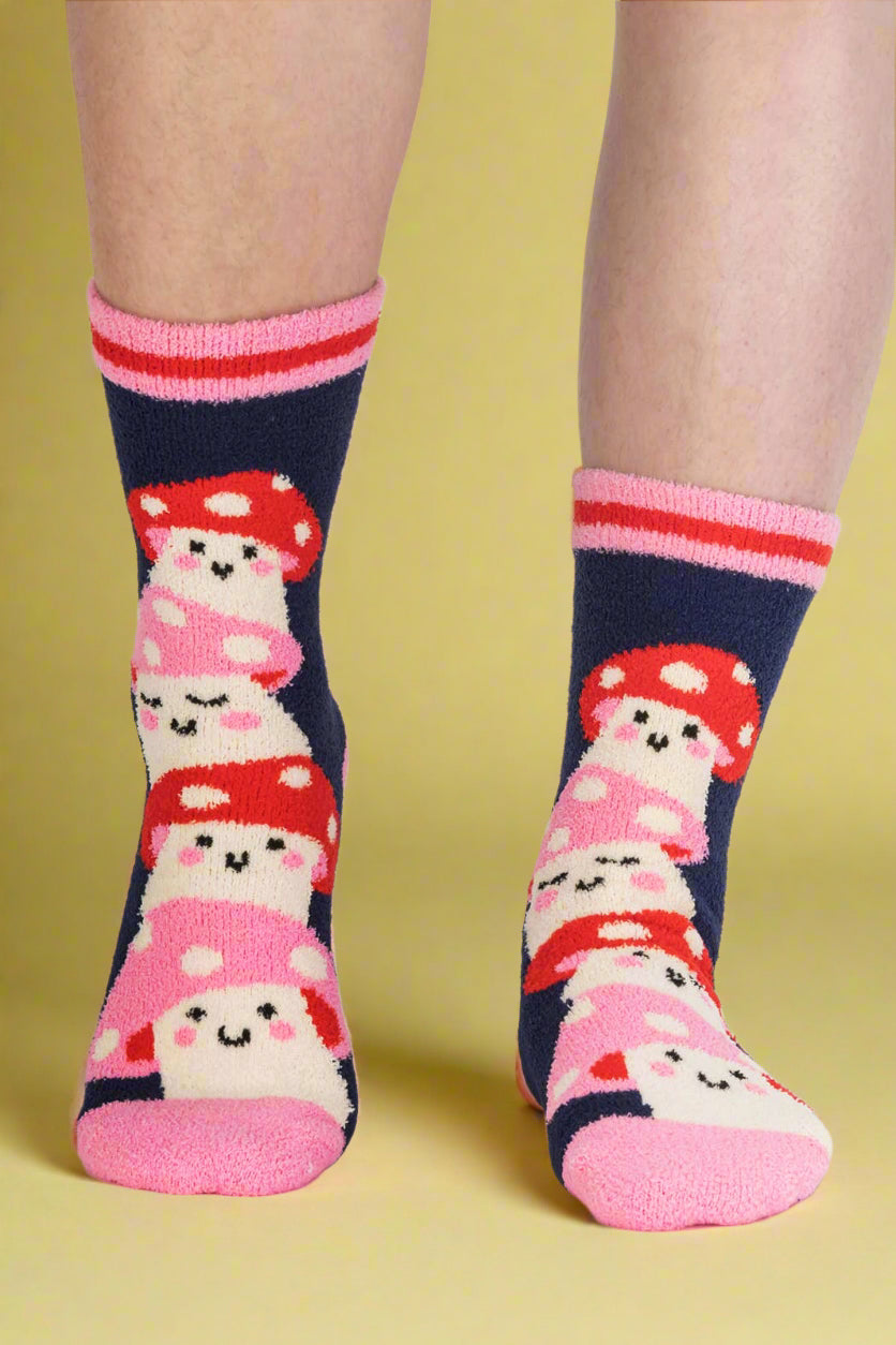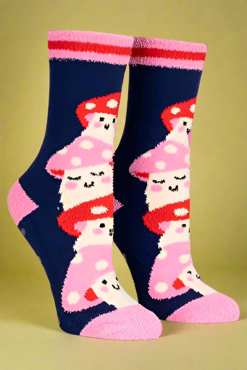 All mushrooms are magical when they're cozied all the way up some comfy socks! These cute smiling fungi red caps and rosy cheeks are day-makers.