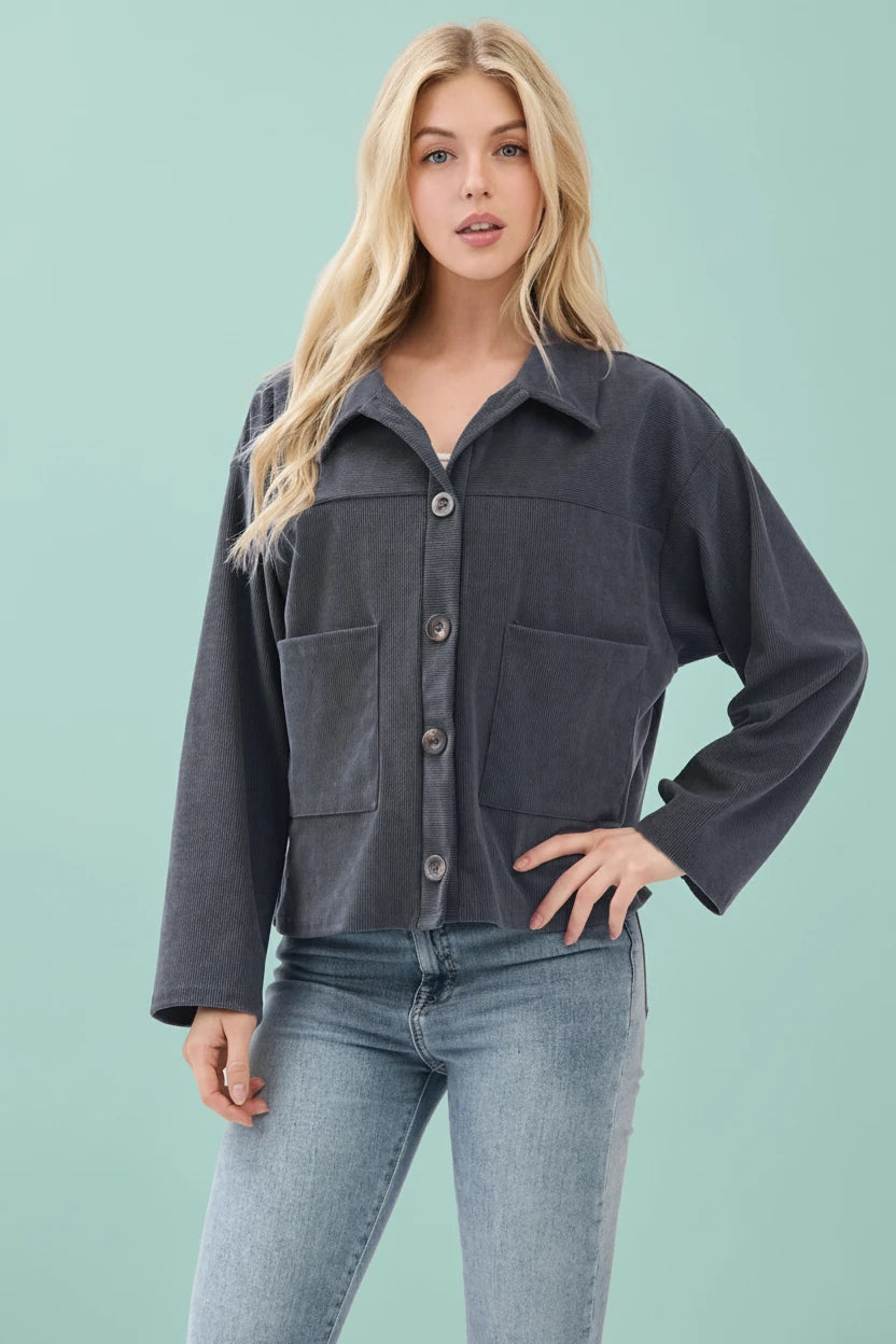This black corduroy jacket nails the perfect blend of casual and cool with its relaxed long sleeves and button-down front. Its soft ribbed texture adds a cozy touch, while the boxy shape pairs effortlessly with high-waisted jeans or lounge pants. An autumn essential that keeps your look cute and comfy wherever you go!