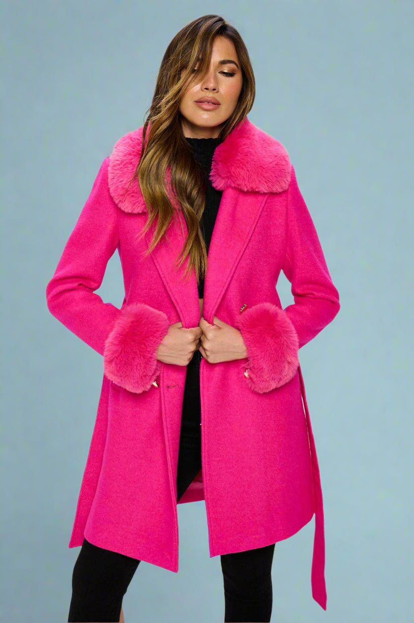 Faux Fur-Trimmed Belted Coat - Hot-Pink