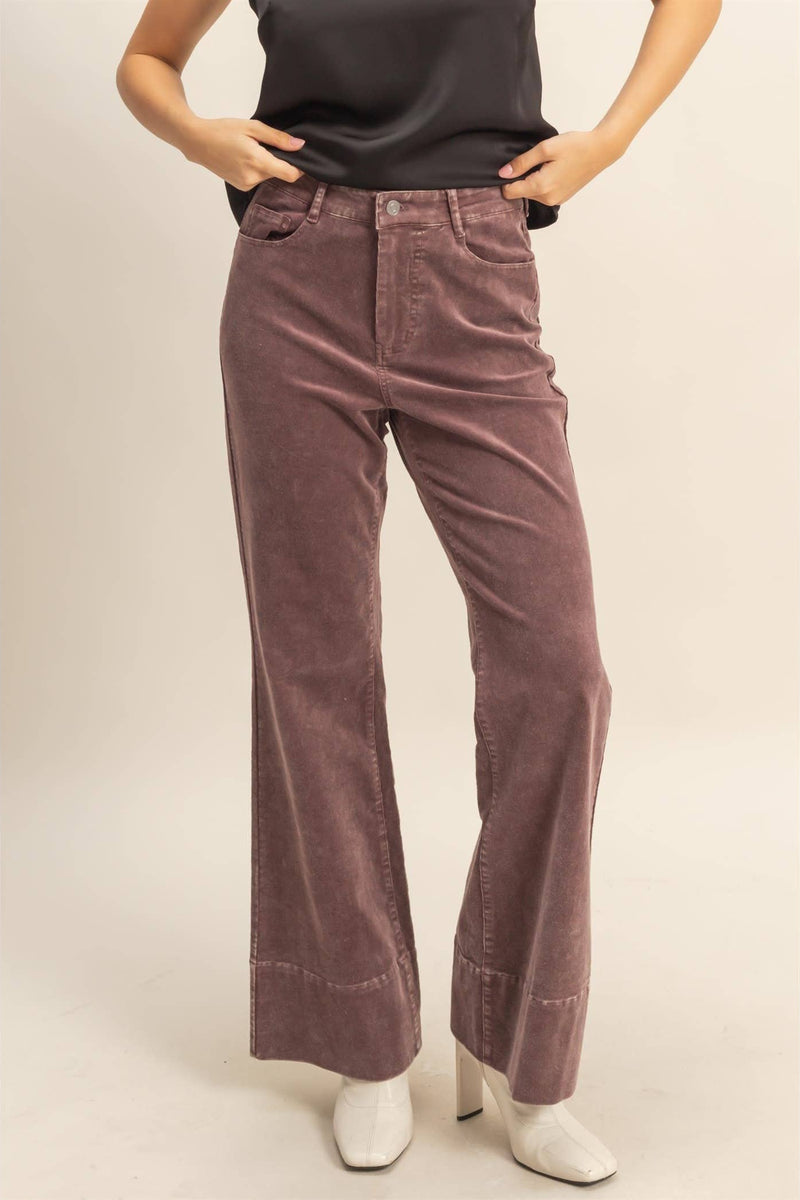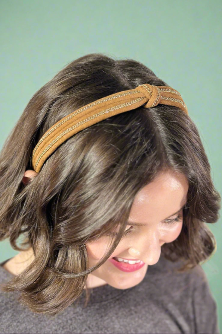 Woman wearing a peach-colored t-shirt and denim shorts on a beige background