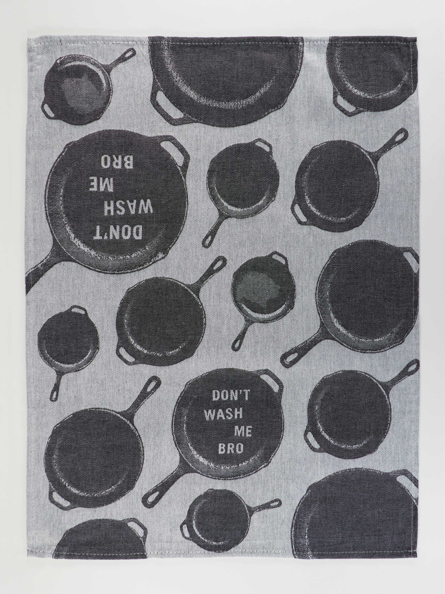 Spice up your kitchen with this dish towel! This grey towel features quirky cast iron skillet prints and the playful phrase "Don't Wash me Bro". Keep your dishes clean and your humor on point with this fun and functional towel.