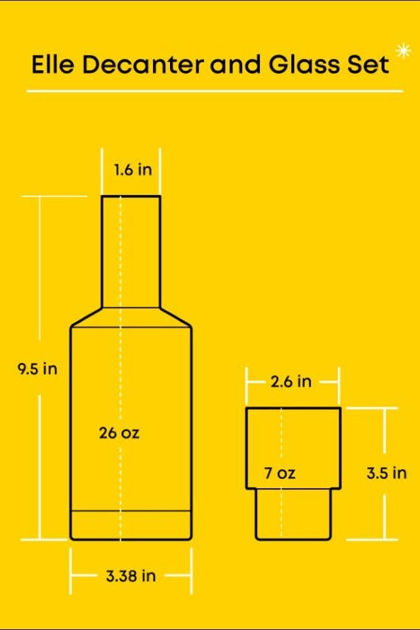 Your new bedside water dispenser jug is 9.5 in tall and holds 26 oz. The ridged glassware is 3.5 x 2.6 in and holds 9 oz. Stable, compact and easy to pour, the Bed side carafe has a 1.6 in wide neck and 3.38 in base and easy to hold!