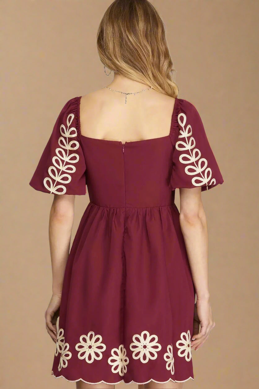 This sweet plum dress steals the show with its puff sleeves, scalloped hem and square neckline. The handy back zip closure makes it a breeze to slip on, while the playful embroidery on the sleeves and hem adds a whimsical charm. Fits every occasion with a splash of fun!