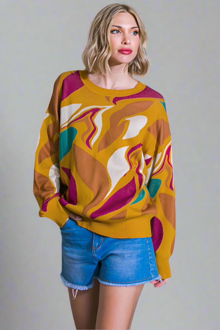 A groovy sweater with a mix of fun autumn color tones. It is light to medium weight with a crew neckline and long sleeves. There is a slight texture to it and is comfortable to wear any day.
