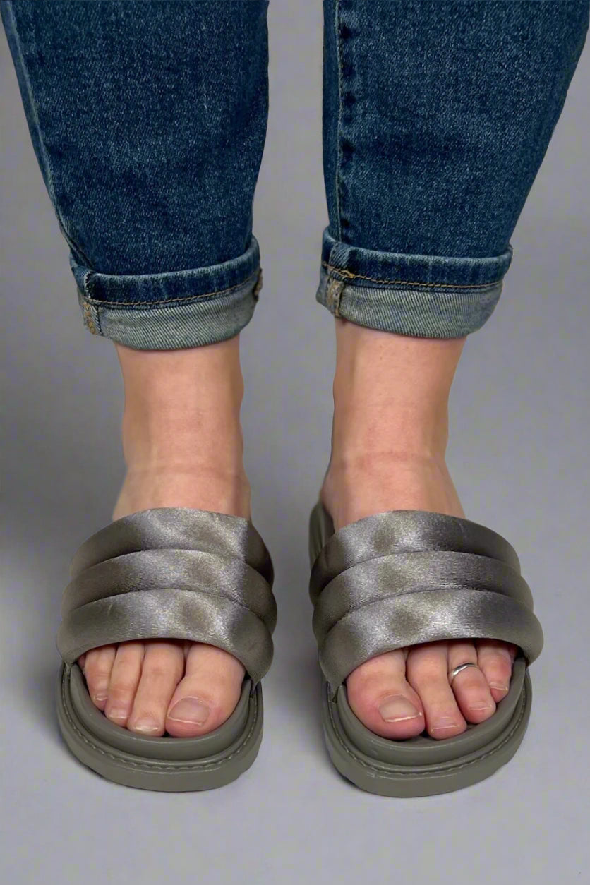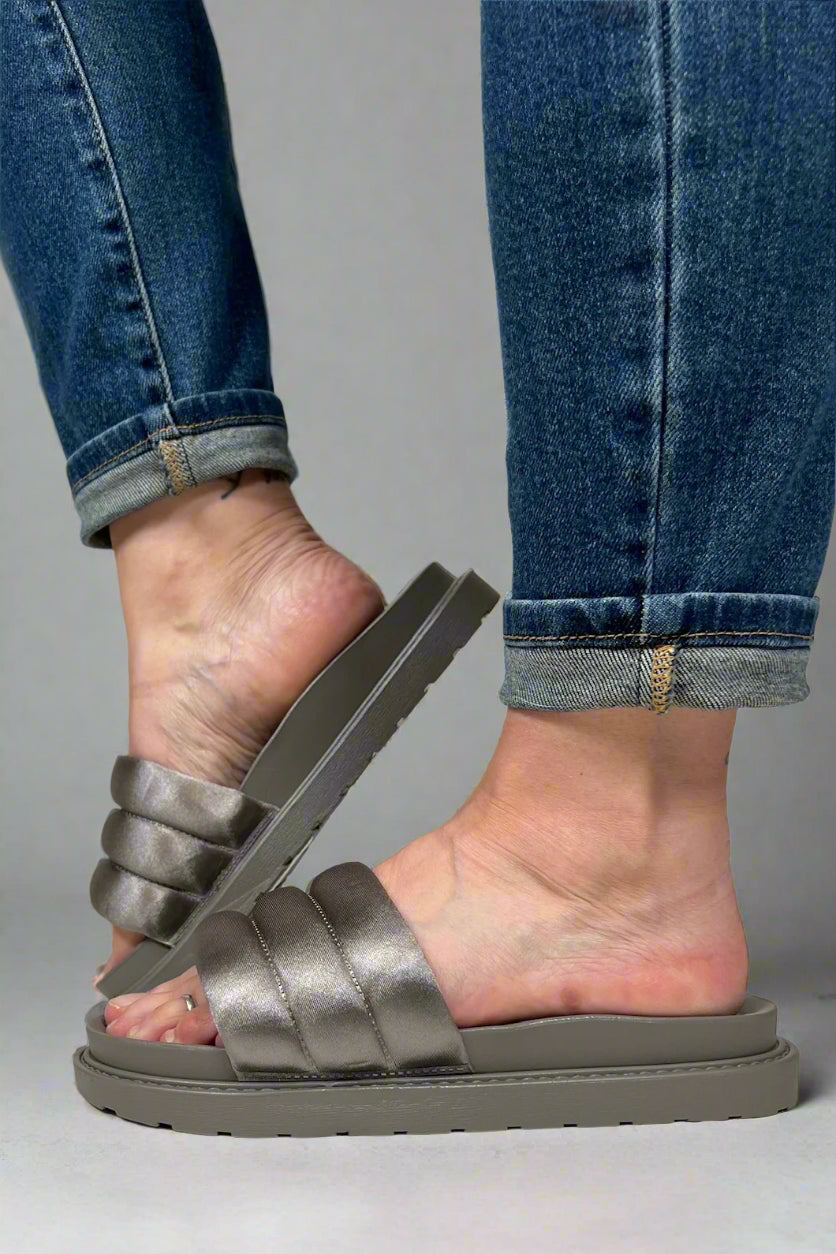 Add a splash of style to your summer wardrobe with these comfy slide sandals! Featuring a thick, cushioned strap and a sunken footbed with extra padding at the ball and heel, they’re perfect for all-day wear.