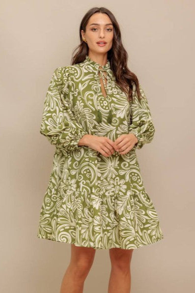 With a lightweight material and a relaxed fit, this dress gives you free movement for an all day wear. It has 3/4 length sleeves with a cinched cuff, a ruffled neckline, tassel strings that come from the neck, and a single tier towards the bottom of the dress.