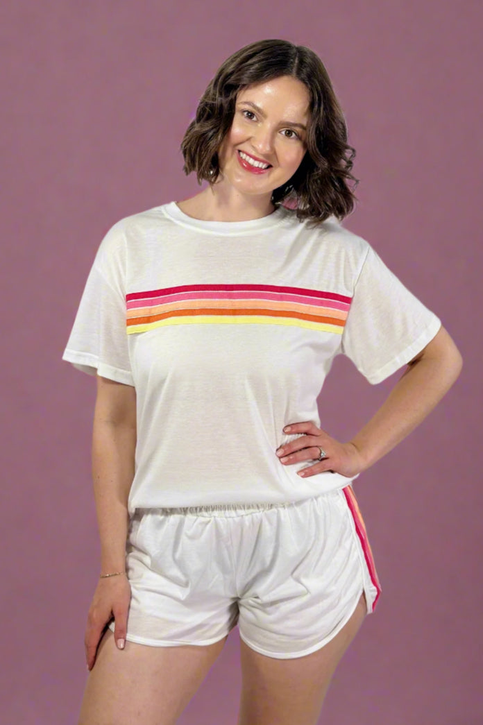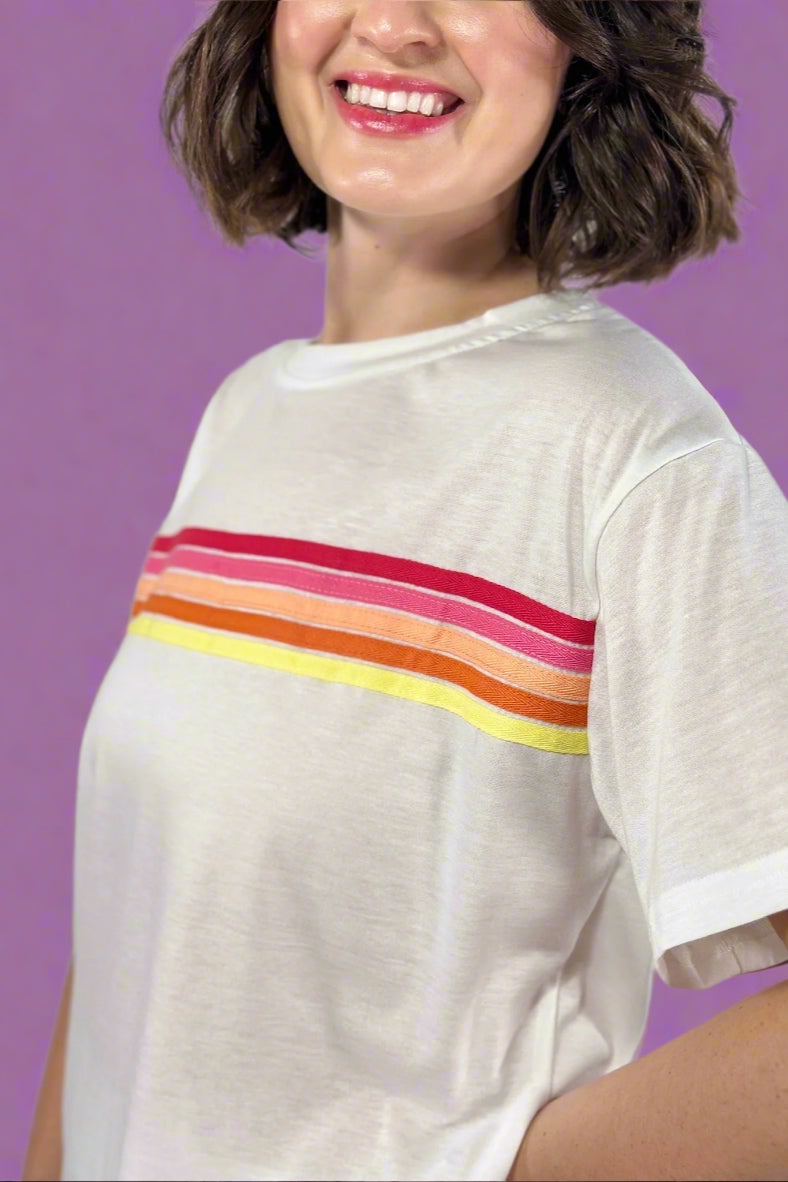 Add some fun to your everyday look with this playful white tee featuring vibrant rainbow stripes. Its soft fabric and classic short sleeves make it perfect for all-day comfort while brightening up any outfit with a cheerful pop of color.