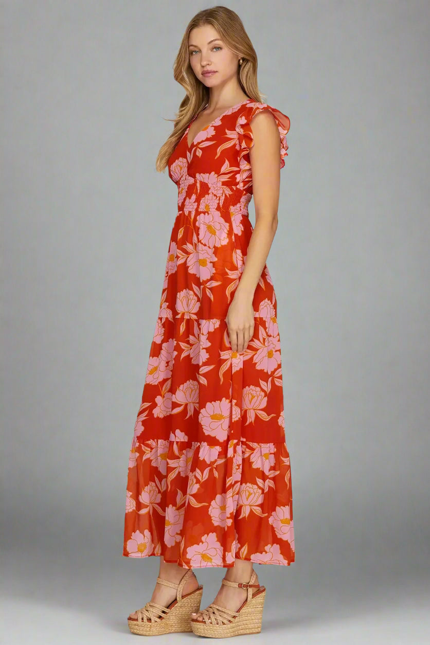 Celebrate with style in this playful floral maxi dress, perfect for wedding guests. Flutter sleeves and a flattering v-neck add a flirty touch, while tiered layers create graceful movement. Plus, convenient pockets keep your essentials close as you dance the night away.