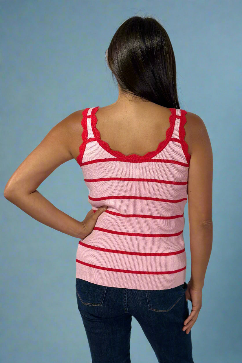 This playful ribbed tank brings a fresh twist to your wardrobe with its crisp rose fabric accented by red stripes. The delicate red scalloped trim along the scoop neckline offers a charming finish. Perfectly fitted to highlight your silhouette, this tank is your go-to for mixing classic stripes with a fun, feminine flair.