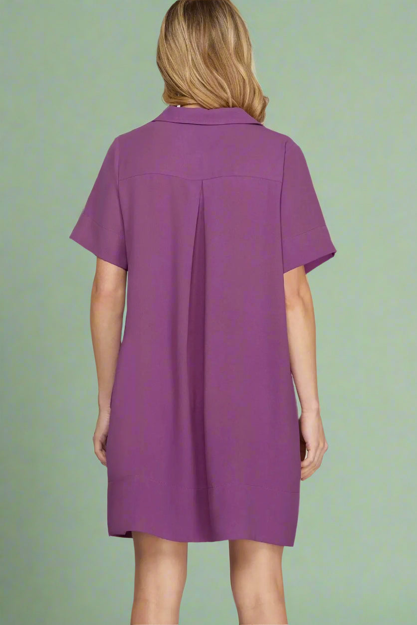 This breezy purple dress is ideal for sunny days. Featuring a playful collar and a soft V neckline, it adds a touch of charm to its easy, relaxed silhouette. With handy pockets and short sleeves, it's the ultimate effortless outfit to slip into whenever adventure calls.