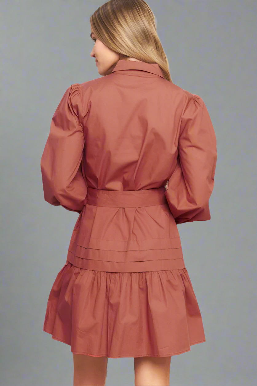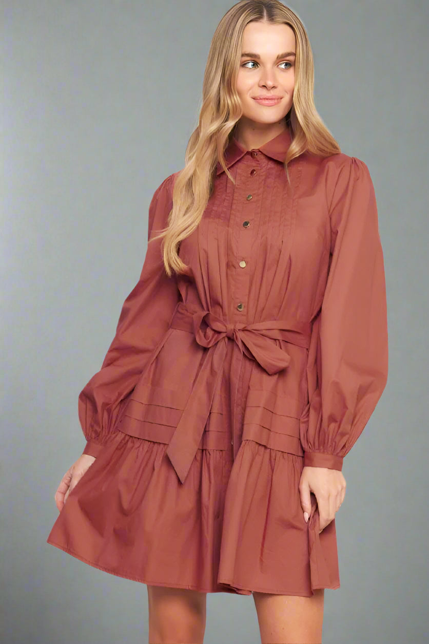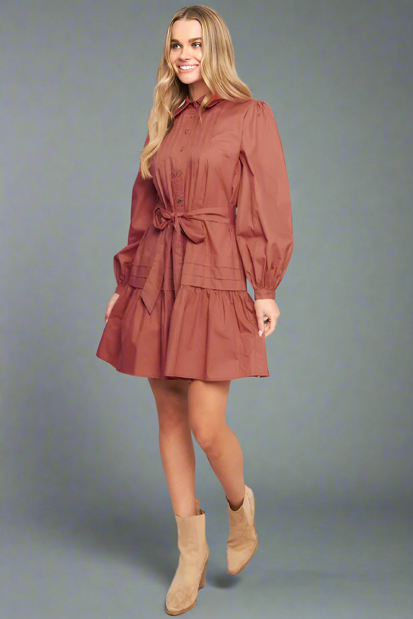 The perfect dress for Fall with a beautiful mauve color, belted look, and comfortable fit. There are buttons down the front, long sleeves, and a collared neckline. For added fun, there a small pleats in the front.