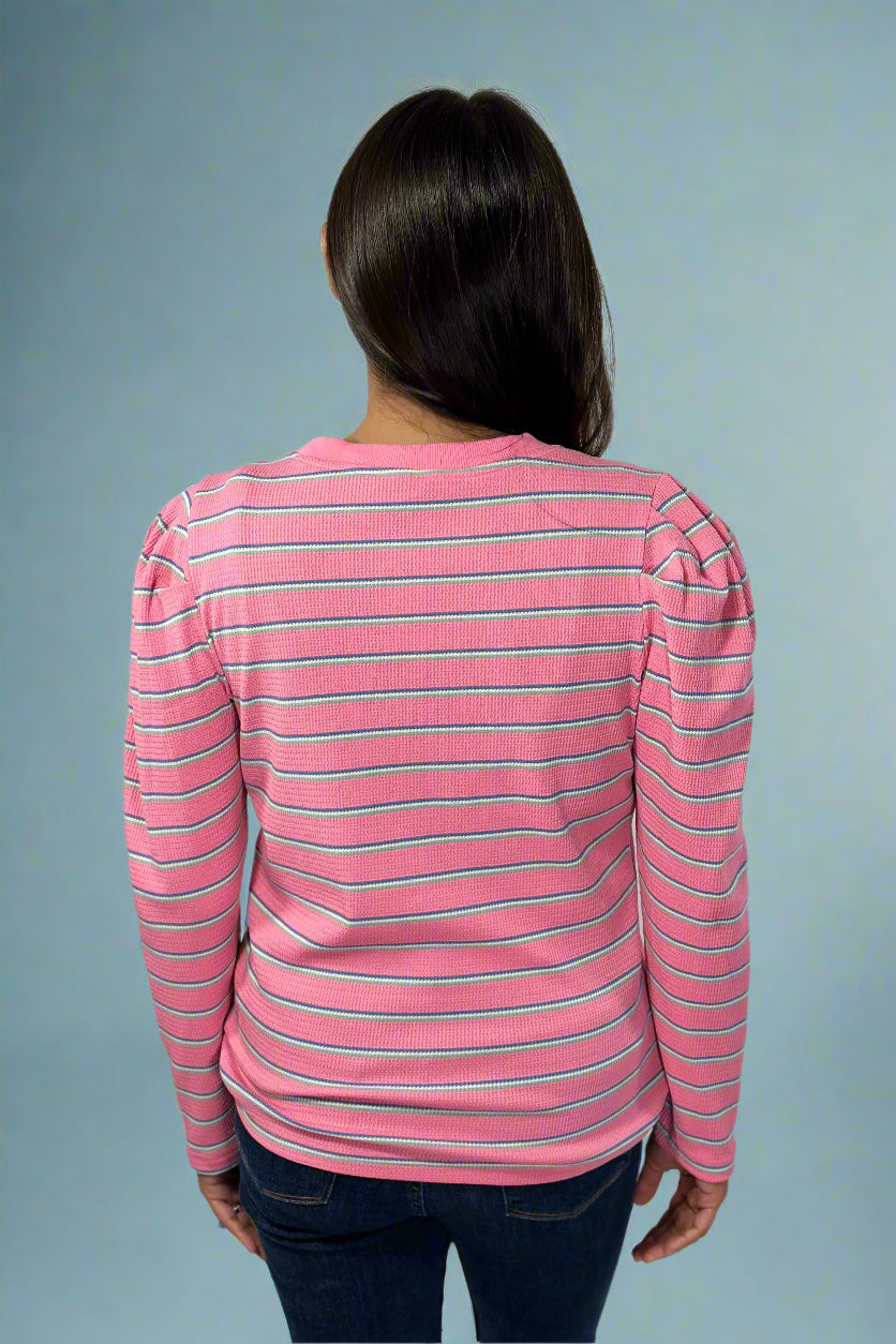 Add a splash of fun to your wardrobe with this playful long sleeve textured top in a soft rose pink. Featuring thin multicolor stripes and a slight puff at the shoulders, it brings a charming twist to the classic crew neck style. Perfect for brightening up any outfit with a subtle pop of color and a touch of whimsy.
