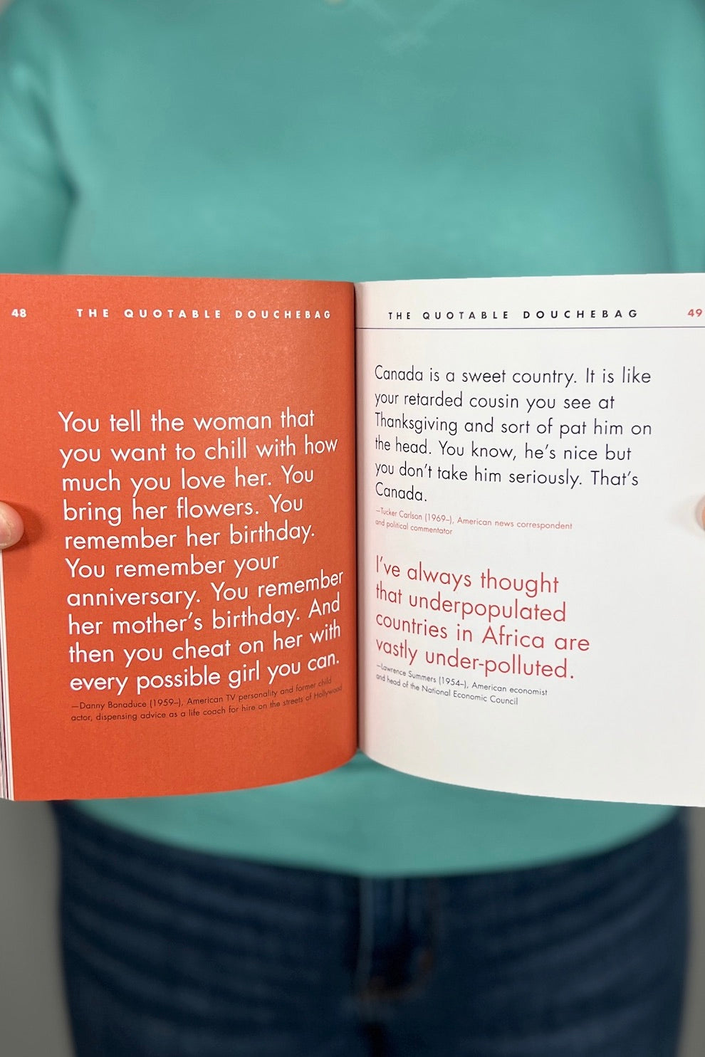 Douchebags have a gift for speaking the unspeakable. Vain, arrogant, brash, and clueless, they're the worst the male species has to offer - and now their most outlandish statements have been comipled into a single volume. The Quotable Douchebag features dozens of boneheaded and tasteless remarks from actors, musicians, athletes, and politicians, including: David Hasselhoff: "There are many dying children our there whose last wish is to meet me."