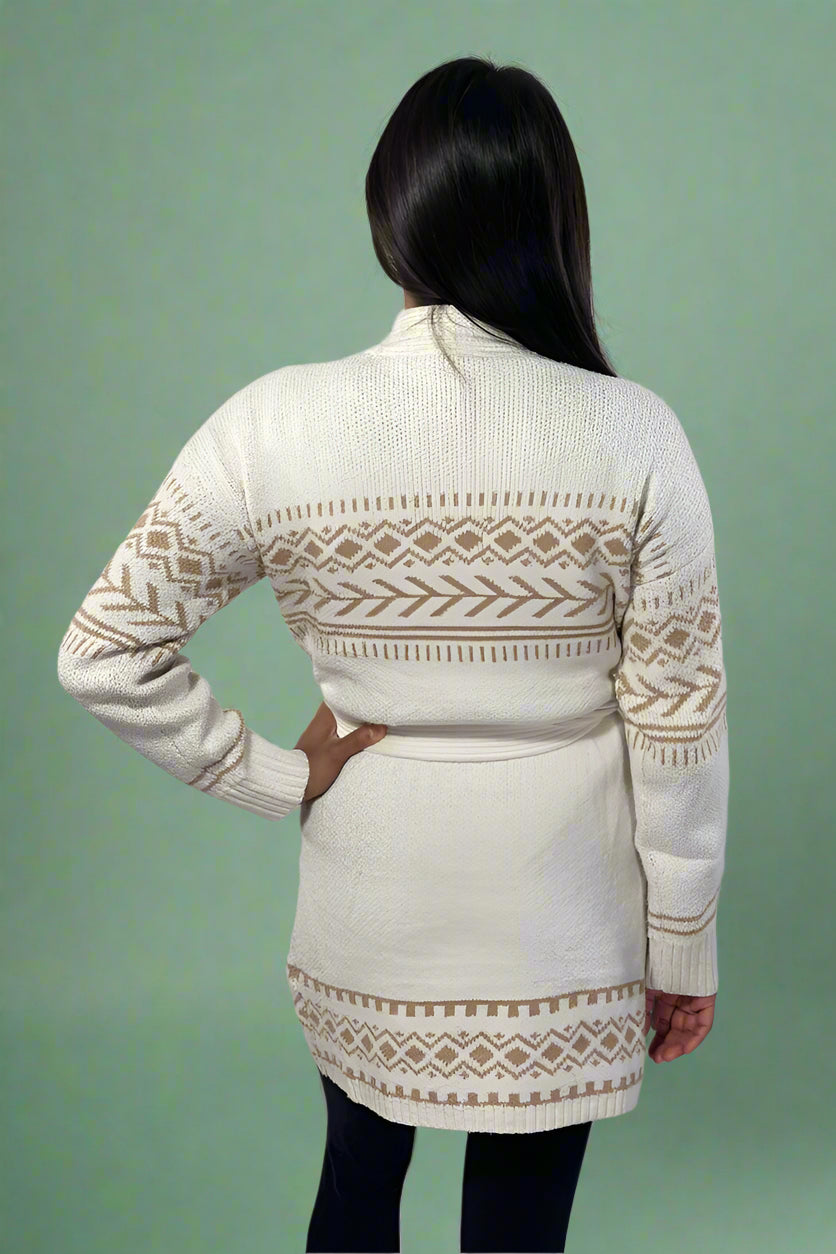 Wrap yourself in cozy charm with this long, open cardigan in a natural shade, featuring a vibrant tribal print that adds a splash of personality to any outfit. The attached waist tie lets you cinch in your silhouette for a flattering fit or wear it loose for a relaxed vibe. Perfect for layering, this playful piece brings warmth and style together effortlessly.