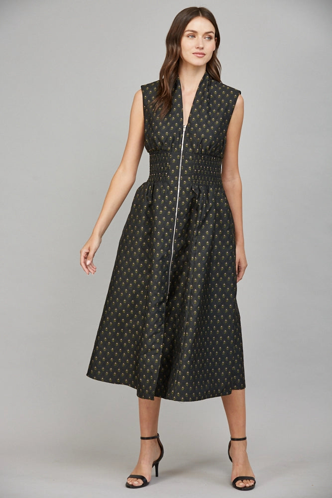Step out in style with this playful black midi dress featuring a flirty front slit and a chic V-neck. The sleeveless design is enhanced with small shoulder pads for a dash of structure, while the smocked waist flatters your silhouette. Crafted from quilted fabric adorned with a delicate floral print, it zips up fully in front for easy wear and added edge. Perfect for twirling through your day with effortless charm!