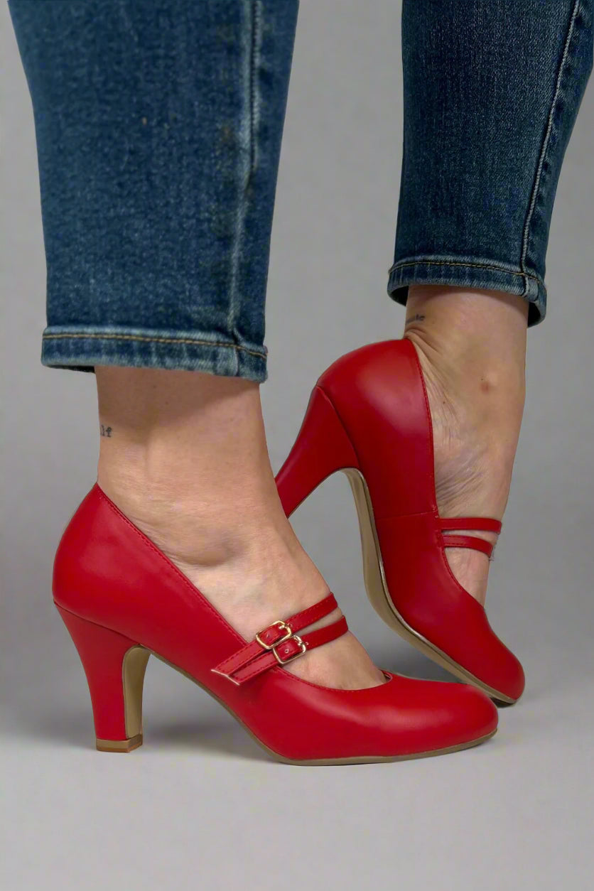 Dress to impress with these Mary Jane pumps. These classic shoes feature premium faux leather uppers and highlight a double strap design with dainty buckle accents across the vamps.